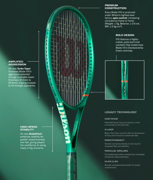 En matière de raquettes de Tennis, après le lancement à la mi-juillet 2025 de l'ULTRA V5, ce mercredi le grand équipementier américain WILSON Sporting Goods Co, leader mondial dans les sports de raquettes, fait l'actualité avec la sortie mondiale de la V10 du désormais célébrissime modèle de raquette WILSON BLADE, la raquette haute performance la plus utilisée par les joueurs/ joueuses sur les circuits ATP/ WTA. A l'occasion de la célébration des 20 ans de cette gamme emblématique (ndlr, lancée donc en 2006), l'équipementier de Chicago a en effet décidé d'apporter un certain nombre de nouveautés et d'innovations à sa raquette phare qui se caractérise globalement par son contrôle et sa capacité à développer un jeu agressif du fond du court.