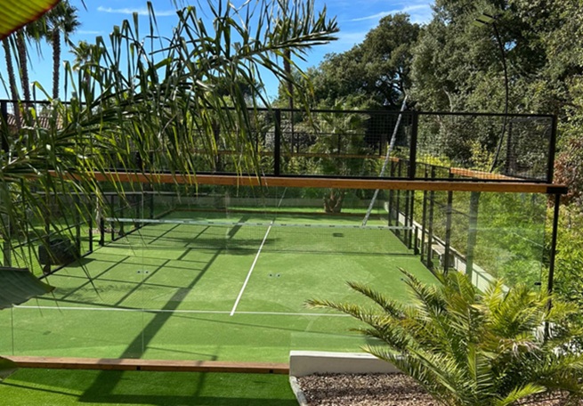 Un autre exemple de court de PADEL, avec son gazon synthétique vert, réalisé par la société SERVICE TENNIS. Crédit photo © SERVICE TENNIS