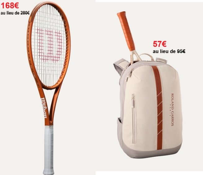 1. Raquette Tennis WILSON x ROLAND GARROS 2025 Blade 98 V9. 168€ au lieu de 280€ (à gauche). 2. Sac à dos WILSON x ROLAND GARROS 2025. 57€ au lieu de 95 (à droite)€