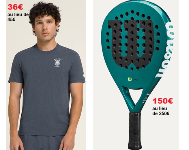 6. T-Shirt (H) WILSON Easy Street. 36€ au lieu de 45€ (à gauche) 7. Raquette Padel WILSON Blade V3. 150€ au lieu de 250€ (à droite)