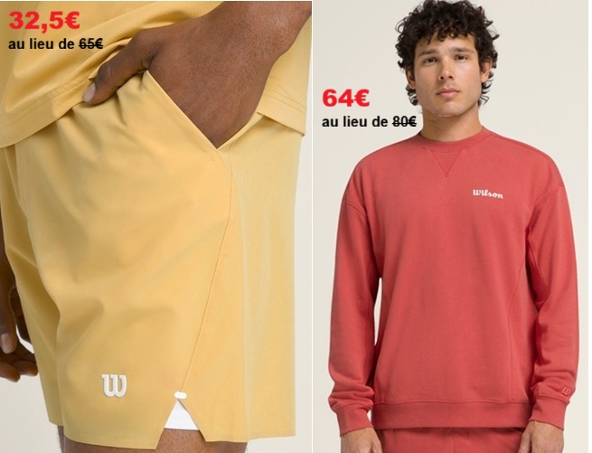 8. Short Tennis WILSON Tournament 7 PO. 32,50€ au lieu de 65€ (à gauche). 9. Sweat WILSON Parkside Crew. 64€ au lieu de 80€ (à droite)