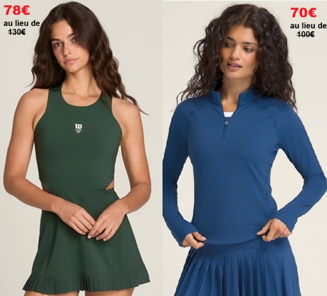 10. Robe de Tennis (F) WILSON Apron. 78€ au lieu de 130€ (à gauche). 11. Haut (F) WILSON Laser Lace Half Zip. 70€ au lieu de 100€ (à droite)