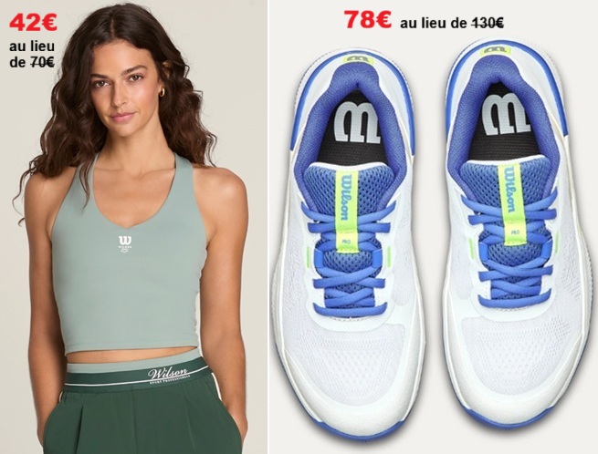 12. Top (F) WILSON Doubles V - Neck Brami. 42€ au lieu de 70€ (à gauche). 13. Chaussures de Tennis (F) WILSON Intrigue Pro. 78€ au lieu de 130€ (ci-dessus)