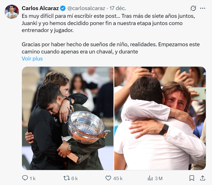 Entre Carlos Alcaraz (1er ATP) et Juan Carlos Ferrero (45 ans), ancien N°1 mondial et coach du Murcien depuis 7 ans, l'histoire est terminée. C'est en effet ce qu'a annoncé le N°1 mondial ce mercredi sur ses réseaux sociaux. Selon le quotidien sportif Marca, un différend financier (ndlr, baisse substantielle du salaire de Ferrero en 2026), serait à l'origine de cette rupture. Ensemble Alcaraz et Ferrero auront donc remporté 24 titres dont 6 titres du Grand Chelem, sans oublier le fait d'avoir atteint la place de N°1 mondial. Toujours selon Marca, Samuel Lopez, l'adjoint de Ferrero, deviendrait le coach de l'actuel N°1 mondial, qui conserverait par ailleurs les autres membres de sa team (ndlr, préprateur physique, mental...).