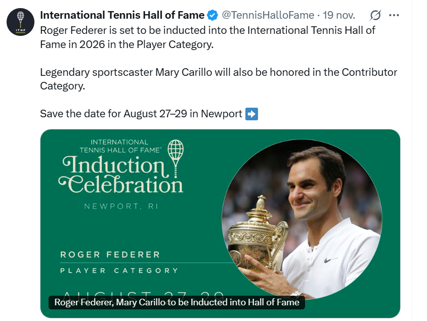 Ce mercredi, le International Tennis Hall of Fame a annoncé que la légende Roger Federer (ex- N°1 mondial), 20 titres du Grand Chelem, serait intronisé en août 2026 à Newport (USA), dans ce club très fermé des grandes légendes (H/F) du tennis. Le Bâlois s'est évidemment montré très enthousiatse à cette perspective : "C'est un très grand honneur de me retrouver aux côtés de beaucoup de grands champions et donc d'être intronisé au temple de la renommée du tennis" a t-il indiqué, ajoutant "être reconnu de cette manière par ce sport et par mes pairs est un très grand honneur; J'ai toujours accordé une très grande importance à l'histoire du tennis et à l'exemple donné par ceux et celles qui m'ont précédé, aussi je serai très content d'aller à Newport en août prochain pour célébrer ce moment."