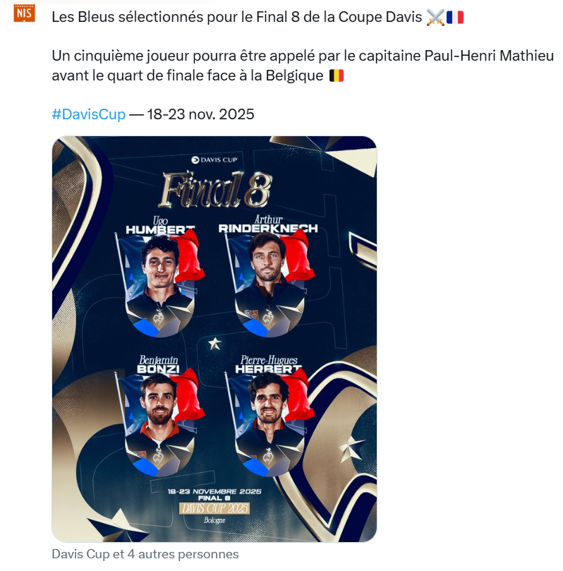 Arhur Fils (30ème ATP), forfait pour cause de blessure au dos, Giovanni Mpteshi Perricard (33ème ATP) et Corentin Moutet (36ème ATP), n'ont pas été retenu. A noter que selon les règlements de l’ITF, le capitaine, qui a la possibilité de sélectionner au total 5 joueurs, peut procéder jusqu’à 3 changements au sein de son équipe jusqu'au lundi 17 novembre, 11 heures. Enfin, en cas de victoire, les Bleus affronteront le vainqueur de la rencontre opposant l'Italie à l'Autriche.