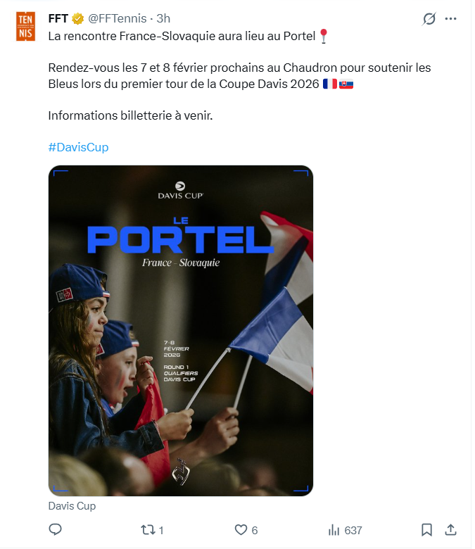 Dans un communiqué diffusé ce mercredi, La Fédération Française de Tennis (FFT) a choisi de confier l’accueil du 1er tour de la phase qualificative de la Coupe Davis 2026 France/ Slovaquie, programmé les samedi 7 et dimanche 8 février prochains, au Portel, dans le Pas-de-Calais (ligue des Hauts-de-France). Cette rencontre aura lieu dans Le Chaudron, la salle qui accueille traditionnellement les matchs du club de basket-ball de l'ESSM Le Portel (Betclic Elite). Dans sa configuration tennis, cette enceinte offrira une capacité de 3400 places. Conformément au choix de l’équipe de France, les matchs se dérouleront sur dur (indoor). Le Chaudron a déjà accueilli l'équipe de France de Billie Jean King Cup à deux reprises ces dernières années : à l'occasion de la rencontre de barrage face aux Pays-Bas en novembre 2022 et lors du premier tour qualificatif face à la Grande-Bretagne en avril 2024. Paul-Henri Mathieu, capitaine des Bleus, communiquera d’ici le 5 janvier prochain la composition de l’équipe de France de Coupe Davis qui, rappelons-le, s'est faite éliminer sans gloire le 18 novembre dernier en 1/4 de finale du final 8 de la compétition face à la Belgique (0/2), à Bologne (Italie, dur, indoor). "Je tiens à remercier la ville du Portel d’accueillir cette rencontre de Coupe Davis entre la France et la Slovaquie. Nous allons pouvoir nous appuyer sur le savoir-faire des équipes d'organisation du Portel, qui avaient magnifiquement relevé le défi en 2022 et 2024 lors des rencontres de Billie Jean King Cup. Je suis convaincu que ce rendez-vous sera une véritable fête du tennis ainsi qu'un vrai succès populaire. Nous avons hâte de retrouver l'incroyable ambiance du Chaudron, où l’équipe de France pourra compter sur le soutien inconditionnel du public pour franchir ce premier tour", a déclaré Gilles Moretton, président de la Fédération Française de Tennis.