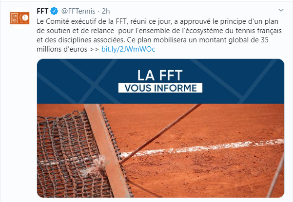A l'image de ce qu'a annoncé la Fédération Britannique de Tennis (LTA) la semaine dernière, en débloquant £20 millions afin de venir en aide à son tennis national  (clubs, entraîneurs, kinés, licenciés...), la FFT a enfin emboîté le pas de ses homologues d'outre-Manche. L'annonce en a été effet faite ce vendredi après-midi, via un communiqué : "Le Comité exécutif de la Fédération Française de Tennis, réuni ce jour, a approuvé le principe d’un plan de soutien et de relance pour l’ensemble de l’écosystème du tennis français et des disciplines associées. Ce plan mobilisera un montant global de 35 millions d’euros. Il s’adressera aux acteurs confrontés à de sérieuses difficultés économiques consécutives à la crise sanitaire, à savoir les clubs affiliés, les enseignants professionnels indépendants, les joueuses et joueurs français du circuit professionnel, les officiels internationaux et les organisateurs de tournois internationaux français. Les modalités pratiques d’attribution des aides seront débattues notamment à l’occasion du prochain Conseil des Présidents de Ligue. Le dispositif détaillé sera communiqué à l’issue du comité exécutif du 15 mai 2020. Solidaire et à l’écoute de tous les acteurs concernés, la Fédération Française de Tennis apportera un soutien adapté à la situation actuelle et sera à leurs côtés pour la reprise de l’activité sportive le moment venu." Si ce plan en effet le bienvenu, on se demande bien en revanche pourquoi la FFT a choisi d'attendre un mois de plus pour décider de la nature de ces aides et de leurs modialiés de versement. Pendant ce temps, et depuis 3 semaines en l'occurrence, un certain nombre d'acteurs du tennis sont sans aucun revenu.