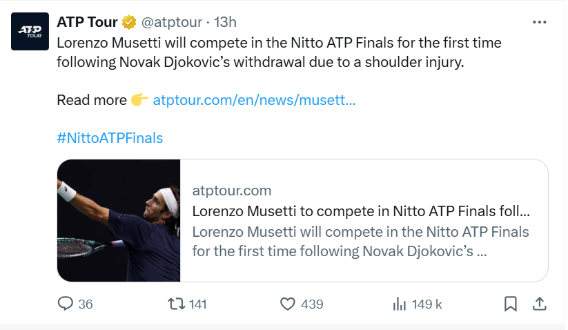Le Masters ATP de Turin (9-16/11) débute ce dimanche avec la traditionnelle phase de poules. Le Groupe Jimmy Connors est composé de : Carlos Alcaraz (2ème ATP), Taylor Fritz (4ème ATP), Alex De Minaur (7ème ATP) et Lorenzo Musetti (9ème ATP), qui remplace Novak Djokovic (5ème ATP) au pied levé blessé à l'épaule à l'occasion de son 101ème titre en carrière remporté au tournoi ATP 250 d'Athènes (Grèce, dur) ce samedi, face à l'Italien. Le Groupe Bjorn Borg est, quant à lui, composé de Jannik Sinner (1er ATP), Alexander Zverev (3ème ATP), Ben Shelton (6ème ATP) et Félix Auger-Aliassime (8ème ATP). Le tenant du titre est Jannik Sinner qui l'avait emporté l'an dernier face à Taylor Fritz en deux sets (6/4 6/4). Comme c'est le cas dans les grands rendez-vous du type de celui du Masters, et encore plus en Grand Chelem, les deux grands candidats au titre sont Sinner et Alcaraz, avec comme enjeu supplémentaire la place de N°1 mondial. A noter que les deux joueurs se sont entraînés ensemble ce samedi et ont disputé un un set. Démarrage du tournoi ce dimanche avec Alcaraz/ De Minaur (14h), suivi de Zverev/ Shelton, ce soir.
