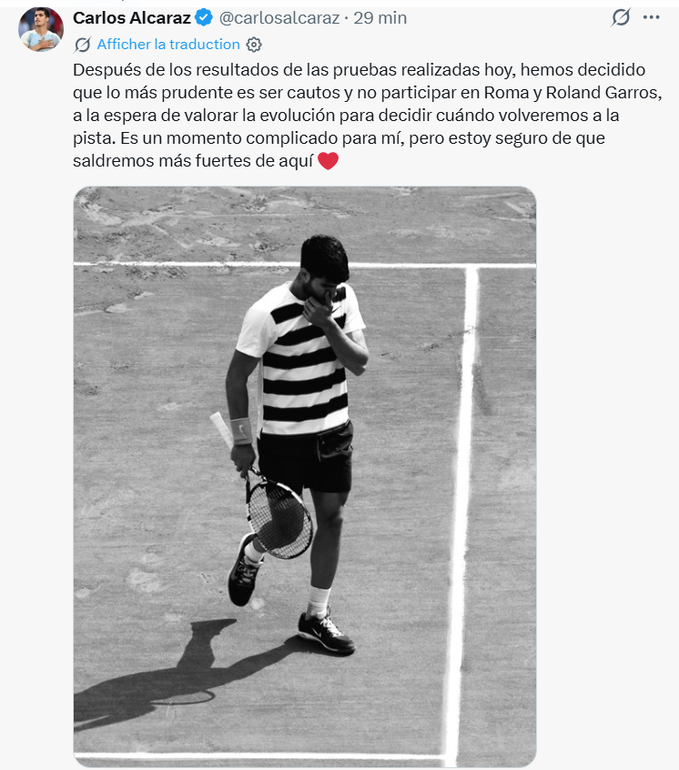 Contraint de déclarer forfait au Masters 1000 de Madrid (terre battue, extérieur) qui se dispute actuellement, suite à la blessure au poignet qu'il a contractée lors de sa victoire au 1er tour du tournoi ATP 500 de Barcelone (terre battue) il y a 15 jours, face au qualifié finlandais Otto Virtanen (130ème ATP), Carlos Alcaraz (2ème ATP) a, hélas, annoncé son forfait ce vendredi en fin de journée sur ses réseaux sociaux pour la prochaine édition de Roland Garros (24/05- 7/06/2026), dont il est le double tenant du titre. "Après les résultats des tests effectués aujourd'hui, nous avons décidé que le plus prudent était de faire preuve de prudence et de ne pas participer à Rome et Roland Garros, en attendant d'évaluer l'évolution pour décider quand nous reprendrons la compétition sur le court. C'est un moment compliqué pour moi, mais je suis sûr que nous en sortirons plus forts." a tenu à s'exprimer le Murcien, sans préciser de date de reprise. A presque 23 ans, le jeune champion espagnol est donc déjà, et ce n'est pas la première fois, confronté aux blessures, comme l'avait été à de nombreuses reprises l'un de ses mentors, Rafael Nadal; Un coup dur pour Alcaraz, bien évidemment, mais également pour le tournoi.